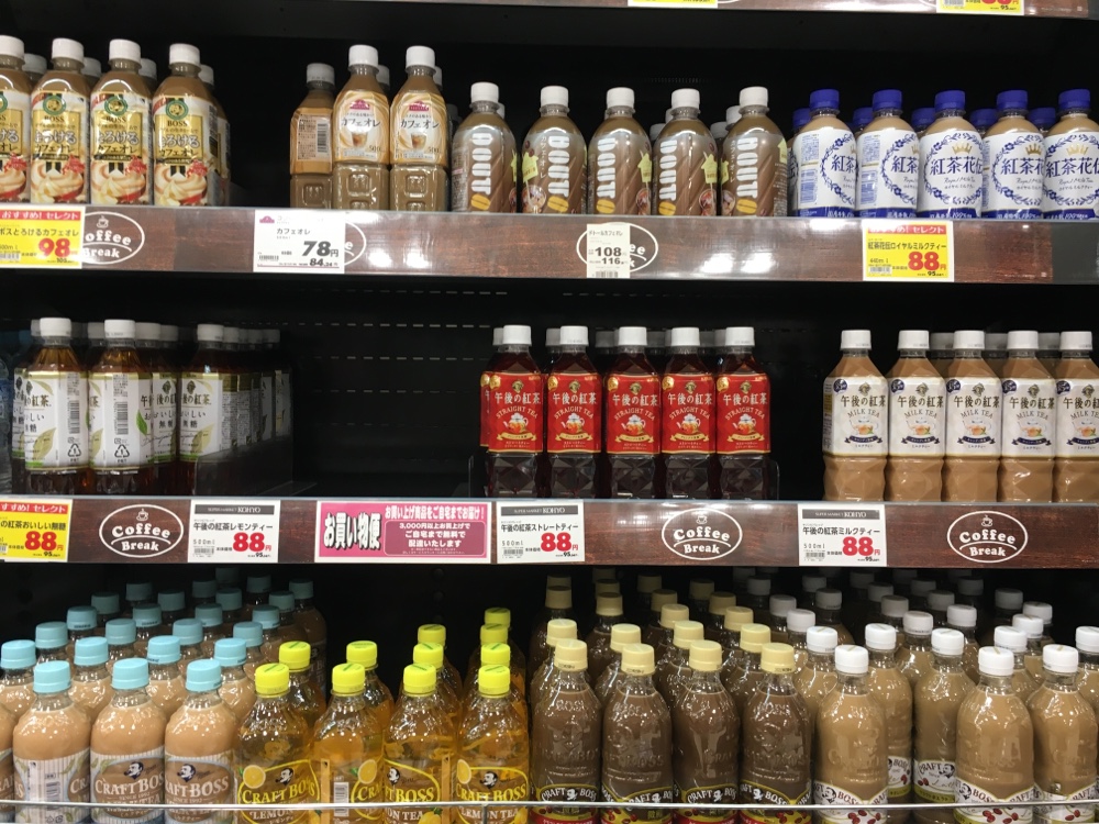 お茶のコーナーでは、ラベルが 緑茶系、麦茶・健康茶系、その他と、大きく3つに分かれています。