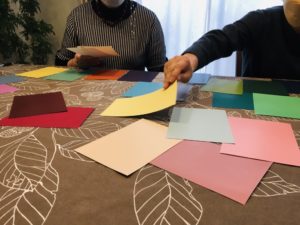 今日はカラーアレンジメントクラスのレッスン日。2月は「色探しワーク」。かるた取りの要領で答えに当たるカードを取って、色の知識を復習します。