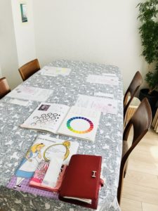 今日はカラーアレンジメントクラスのレッスン日。7月は色の三属性に基づく「色の心理効果」を学びます。まずは「色の三属性」を復習。「色の三属性」は色の入り口にあたる色の基礎になる特徴で、重要項目。忘れた頃に復習しています。思い出した後に、補色と清色・濁色のしくみを復習しました。
