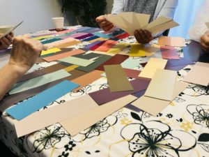 今日はカラーアレンジメントクラスのレッスン日でした。5月は『色探しゲーム』。以前学んだ色の三属性とトーン、清色・濁色、補色を復習した後、問われた色をカラーカードから探します。そして、みんなで色を確認。