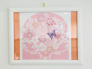 今月のマンションディスプレイは、切り紙細工。明るく軽やかな色使いにしました。