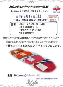 来週15日(土) あべのハルカス近鉄本店 5階「街ステーション」で【パーソナルカラー診断&骨格スタイルアドバイス】を行います。ただ今 ご予約受付中!